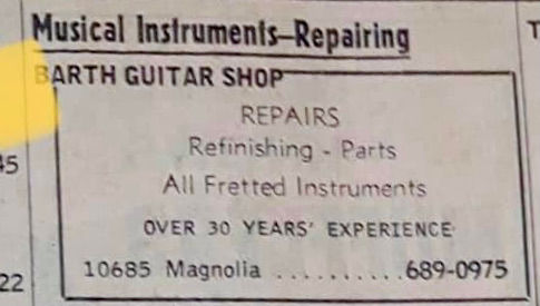 Paul Barth’s last guitar shop before he died in 1973 was at 10685 Magnolia Avenue Riverside California